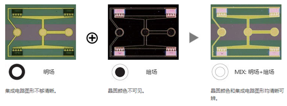 暗場(chǎng)是檢測(cè)標(biāo)本上細(xì)微劃痕或缺陷以及晶片等鏡面樣品的理想工具。MIX照明可讓使用者即可觀察圖形也可觀察色彩。