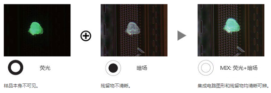 熒光觀察適用于使用專用濾色片立方照明時(shí)能夠發(fā)光的樣品。其可用于檢測(cè)污染物和光致抗蝕劑殘留物。MIX照明可實(shí)現(xiàn)光致抗蝕劑殘留和集成電路圖形的觀察。