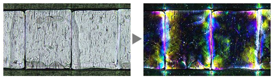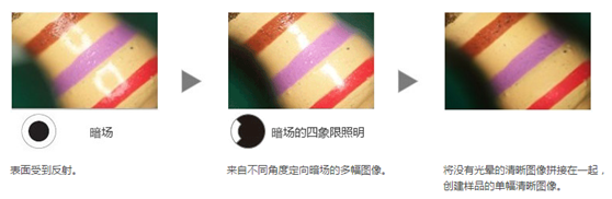 通過將暗場(chǎng)與諸如明場(chǎng)、熒光或偏光等其他觀察方法結(jié)合使用,MIX觀察技術(shù)能夠獲得獨(dú)有的觀察圖像。MIX觀察技術(shù)可讓用戶發(fā)現(xiàn)用傳統(tǒng)顯微鏡難以看到的缺陷。暗場(chǎng)觀察所用的環(huán)形LED照明器具有在指定時(shí)間僅使用四分之一象限的定向暗場(chǎng)功能。該功能可減少樣品光暈,對(duì)于樣品表面紋理的可視化非常有用。