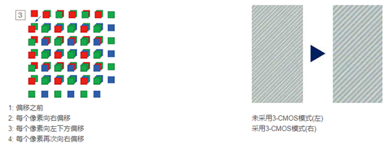 3-CMOS模式是將我們廣受歡迎的3-CCD模式技術與DP74相機CMOS傳感器配合使用的一種功能。230萬像素的CMOS與像素偏移技術結合可產生2070萬像素的分辨率。除了傳統的每像素單色3 x 3像素偏移之外,DP74相機的3-CMOS像素偏移模式還可在單像素內實現三色圖像分辨率(RGB),從而進一步提高分辨率。