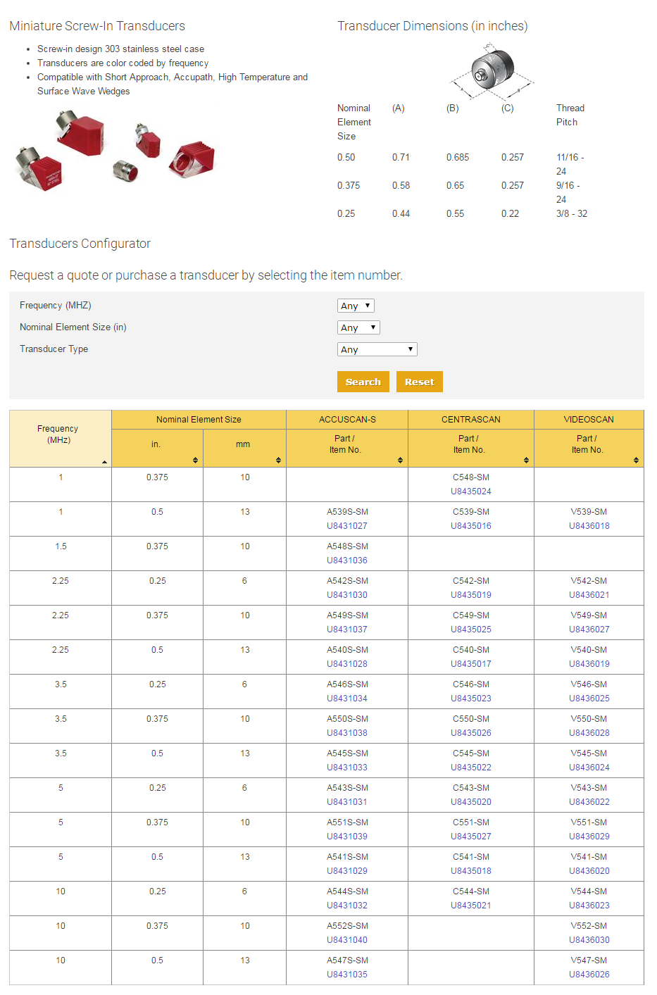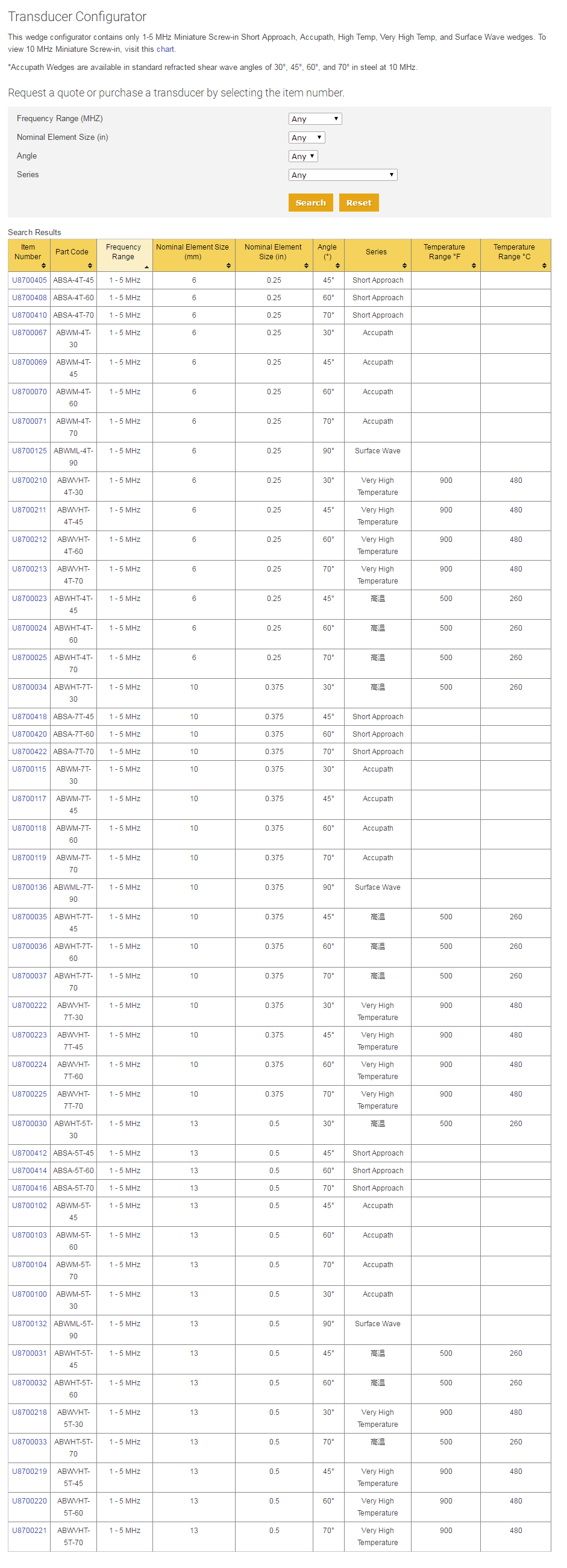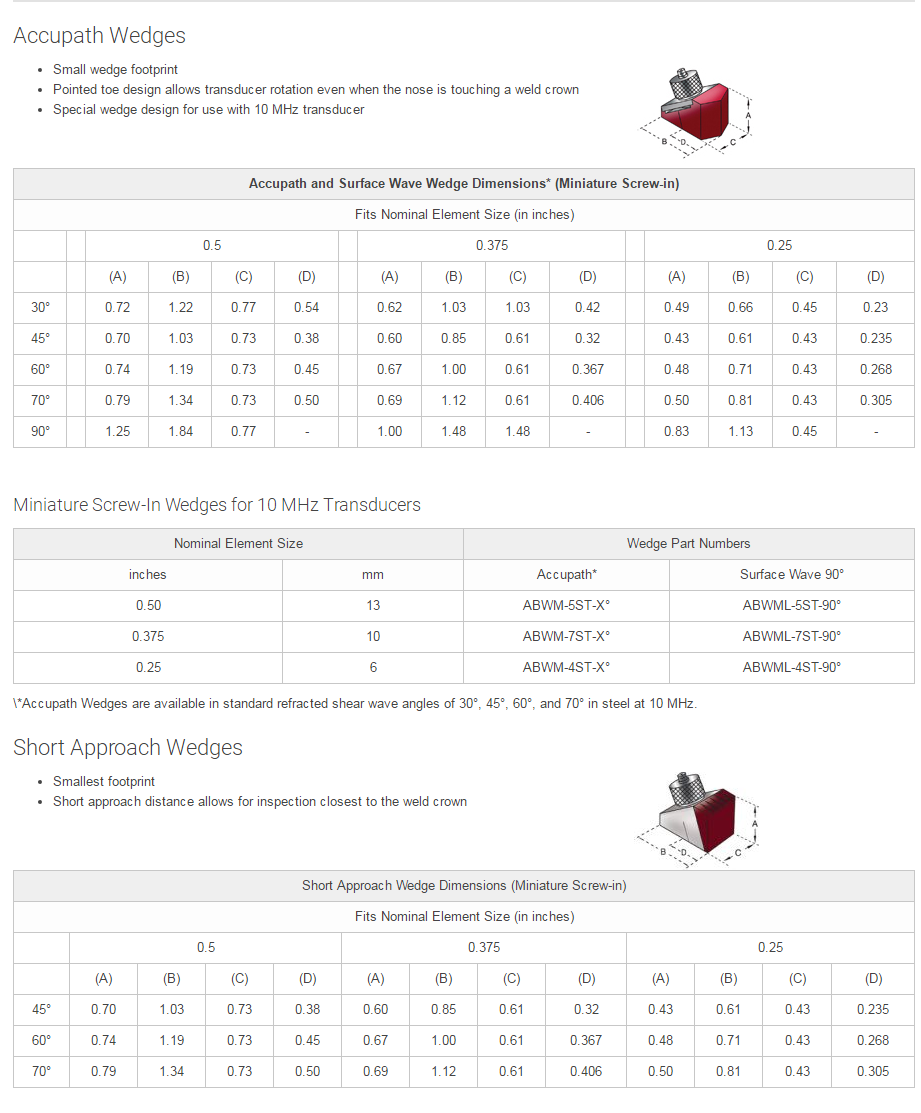 Miniature Angle Beam Transducers and Wedges are used primarily for testing of weld integrity. Their design allows them to be easily scanned back and forth and provides a short approach distance. Angle beam transducers are single element transducers used with a wedge to introduce a refracted shear wave or longitudinal wave into a test piece.
