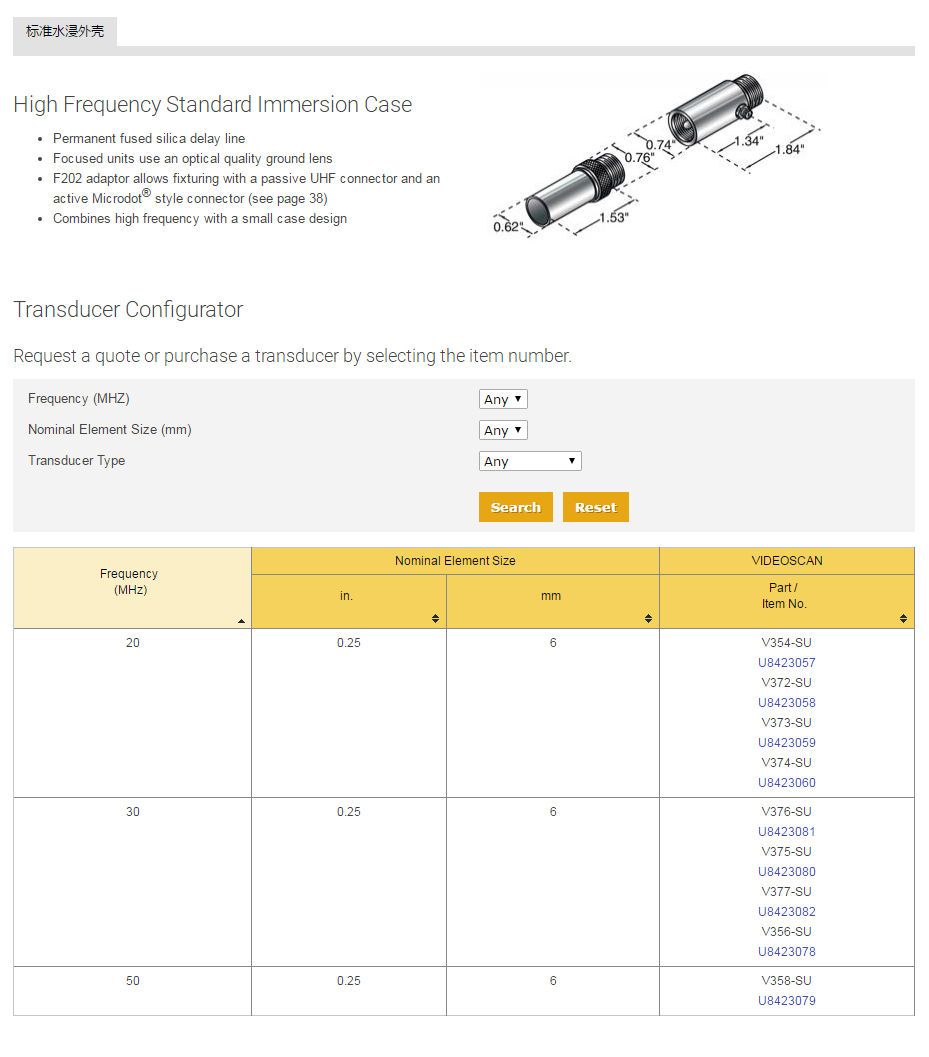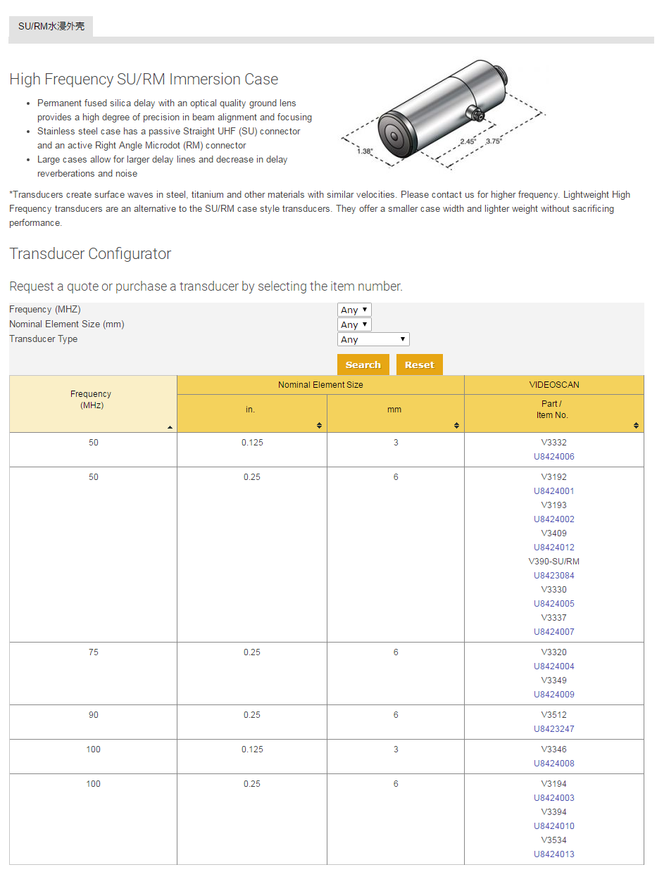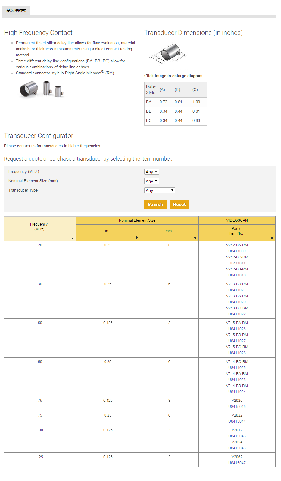 Advantages: Heavily damped broadband design provides excellent time resolution Short wavelengths for superior flaw resolution capabilities Focusing allows for very small beam diameters Frequencies range from 20 MHz to 225 Mhz