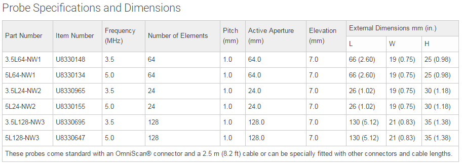 Near-wall probes offer a shortened dead zone at both ends of the probe (1.5 mm between center of first or last element and housing edge). They are well suited for composite channel inspections and are used for C-scan inspections of composites (delamination, disbonding, and porosity).