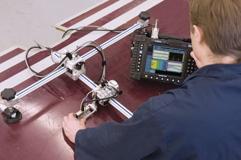 Commonly inspected materials include composites and aluminum, using suction-cup pods; and carbon steel, using optional magnetic pods.